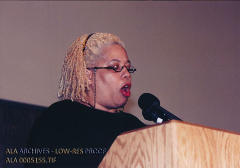 Gladys Smiley Bell, President of the Black Caucus of the American Library Association, speaking at the Martin Luther King, Jr. Holiday Observation and Sunrise Celebration at the 2001 ALA Midwinter Meeting in Washington, D.C.
