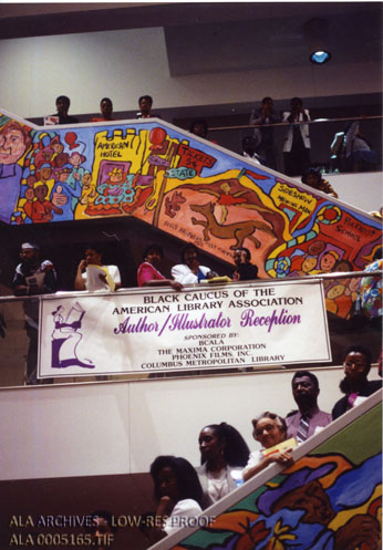 Authors and Illustrator Reception of the first National Conference of African American Librarians at the Columbus Metropolitan Library. Banner reads: "Black Caucus of the American Library Association Author/Illustrator Reception"