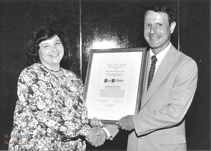 Joan DelFattore receiving the Eli M. Oboler Memorial Award for What Johnny Shouldn't Read: Textbook Censorship in America at the 1994 ALA Annual Conference.
