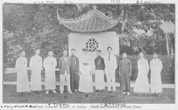 Photograph of staff and members of the first class of the Boone University Library School. Includes Mary Elizabeth Wood, T.C.S. Hu and Samuel T. Y. Seng (Shen Zurong).