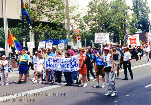 The ALA Gay and Lesbian Task Force marching in the San Francisco Pride March. Some signs in the march read, "Coming Soon! Gay & Lesbian Center at the New Main."