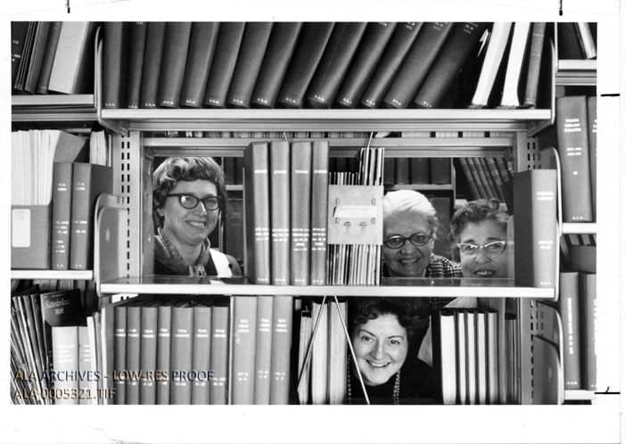 Photograph of the ALA Headquarters library staff peeking through the library stacks.