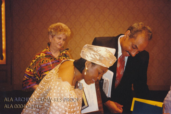 Photograph of Kathleen Atkins Wilson holding her Coretta Scott King Award, next to an unidentified man and Ann Miller (jury member) at the 1993 ALA Annual Conference in New Orleans.