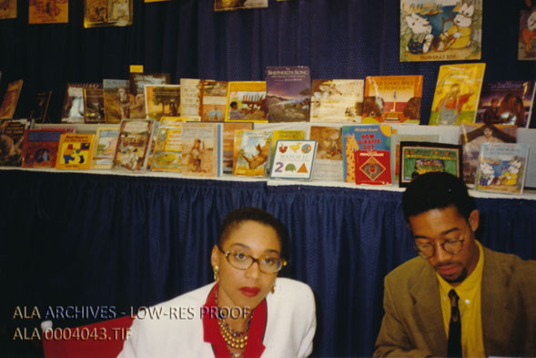 Authors Brian and Andrea Davis Pinkney signing books at the Dial Books booth at the 1993 ALA Annual Conference in New Orleans.