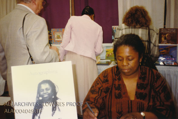 Carole Byard signing books Harcourt booth at the 1993 ALA Annual Conference at New Orleans.