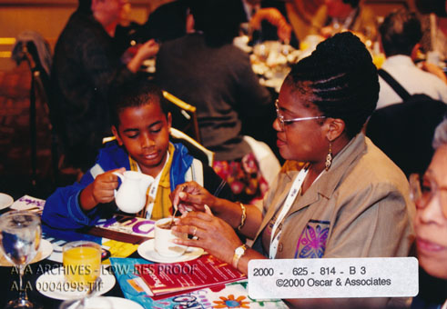 Unidentified attendees at the Coretta Scott King Book Award Breakfast at the 2000 ALA Annual Conference in Chicago. Found in series 56/43/13, Box 1, Folder: 2000