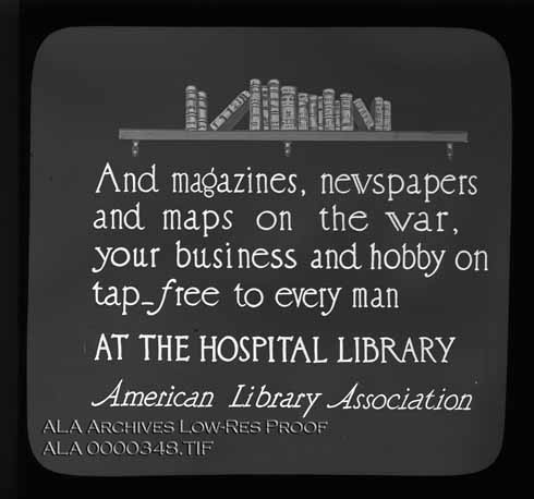 Glass plate slide. Caption reads: "And magazines, newspapers and maps on the war, your business and hobby on tap - free to every man in camp. AT THE HOSPITAL LIBRARY"