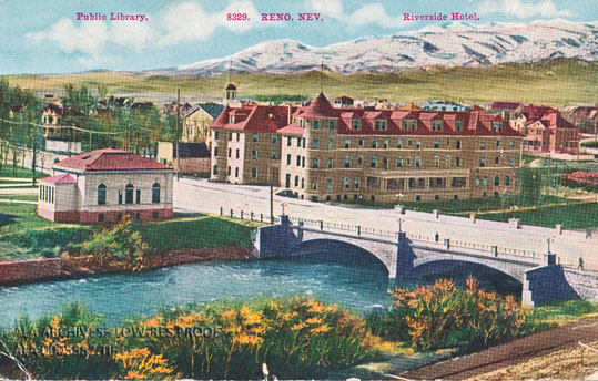 Postcard of the Public Library and Riverside Hotel in Reno, Nevada.