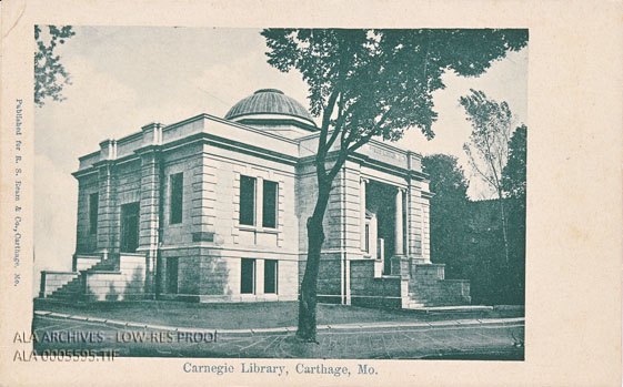 Postcard of the Carnegie Library in Carthage, Missouri. Published by RS Beam & Co., Cathrage Mo.
