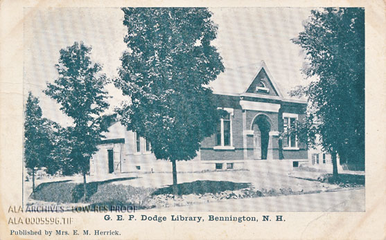 Postcard of the G.E.P. Dodge Library in Bennington, New Hampshire. Published by Mrs. E.M. Herrick.