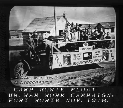 Glass plate slide depicting servicemen riding on an American Library Association float. Caption reads: "Camp Bowie Float, United War Work Campaign, Fort Worth (Texas), November 1918" Slogans on the float read: "Books Follow the Flag" and "Here to Over There."