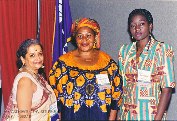 Photograph of the ALA International Reception hosted by the International Relations Round Table at New York University's Bobst Library at the 1996 ALA Annual Conference in New York City. Including Bandana Sen, Chinwe Agbakobo, and Francoise Sidibe.