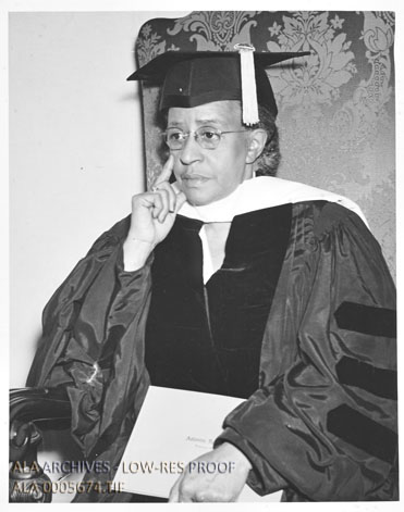 Librarian Sadie Peterson Delaney in graduation regalia, receiving an honorary doctorate from Atlanta University in 1950.