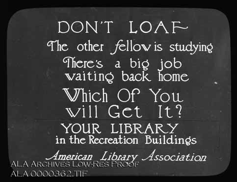 Glass plate slide. Caption reads: "DON'T LOAF. The other fellow is studying. There's a big job waiting back home. Which Of You Will Get It? YOUR LIBRARY in the Recreation Buildings"