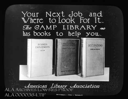 Glass plate slide. Caption reads: "Your Next Job and Where to Look For It. The CAMP LIBRARY has books to help you."