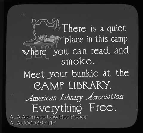Glass plate slide. Caption reads: "There is a quiet place in this camp where you can read and smoke. Meet your bunkie at the CAMP LIBRARY. American Library Association Everything Free"