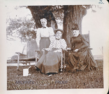 Photograph of Lodilla Ambrose, Frances Bishop, and Mrs. Moses Wadley under a tree at the ALA Annual Conference at Lakewood-on-Chautauqua, New York.