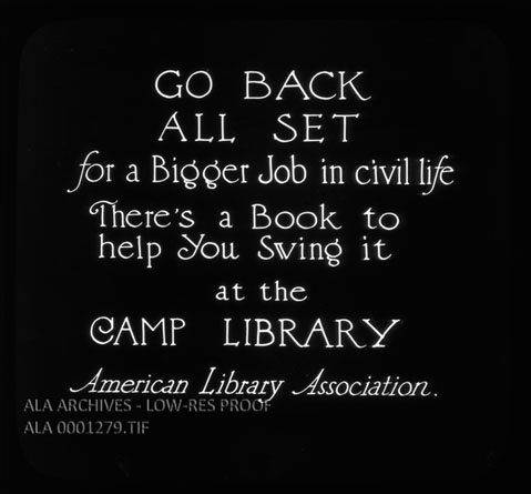 Glass plate slide. Caption reads: "GO BACK ALL SET for a Bigger Job in civil life There's a Book to help you swing it at the CAMP LIBRARY"