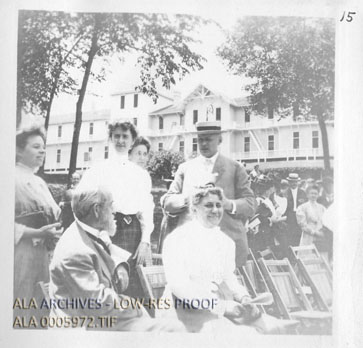 Group of conference attendees outside at the ALA Annual Conference at Lake Minnetonka. Includes Arthur Bostwick and Agnes Van Valkenburgh,