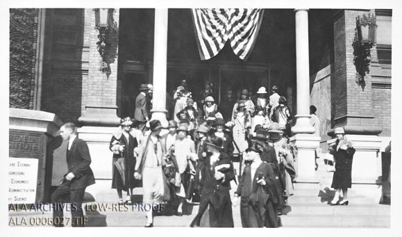 Photograph of conference attendees leaving the Drexel Institute in Philadelphia during the ALA Fiftieth Anniversary Conference.
