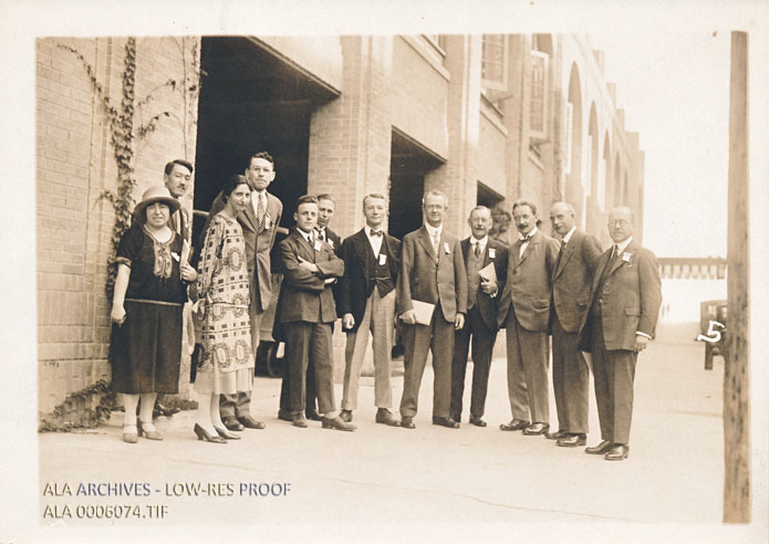 A group of foreign delegates in Atlantic City during the ALA Fiftieth Anniversary Conference. Includes Sophie Udin, Tamaki Yamado, Rachel Sedeyn, H.B. Van Hoesen, Theo. Schilling, A. G. Drachmann, Camille Gaspar, Walter Powell, R. F. Sharp, E. A. Savage, S. A. Pitt, and Andre Bonet.