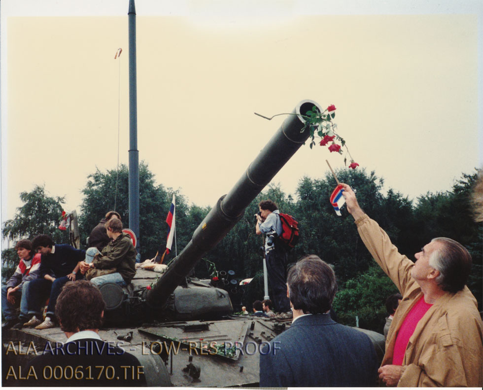 Moscow Coup - Man Putting Flowers in a Tank Barrel | The American Library Association Archives