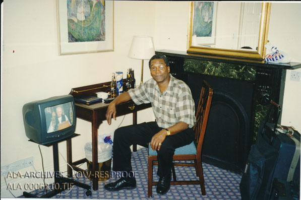 Photo of Kniffel's partner, Carlon Walker, watching television in their London hotel room, turning toward the camera.