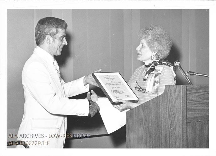 Peggy L. Pfeiffer presenting John M. Franco the American Association of School Librarians' Distinguished Library Service Award for School Administrators award at the 1977 ALA Annual Conference in Detroit.