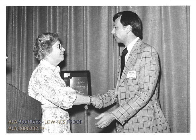 American Association of School Librarians President, Anna Mary Lowry, presents Glenn Estes a plaque for 9 years as editor of the School Media Quarterly at the 1979 ALA Annual Conference at Dallas.