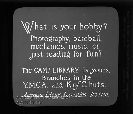 What is your hobby? Photography, baseball, mechanics, music, or just reading for fun? The CAMP LIBRARY is yours. Branches in the Y.M.C.A. and K. of C. huts. | The American Library Association Archives