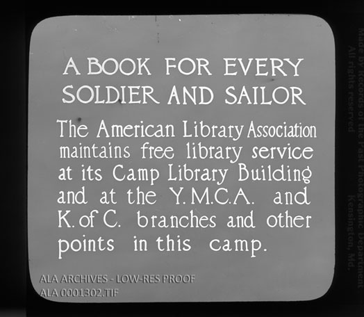Glass plate slide caption reads: "A BOOK FOR EVERY SOLDIER AND SAILOR The American Library Association maintains free library service at its Camp Library Building and at the Y.M.C.A. and K. of C. branches and other points in this camp."