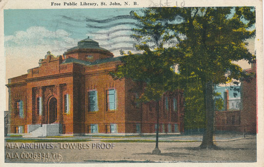 Postcard of the Free Public Library in St. John, New Brunswick, Canada. Published by the Valentine & Sons United Publishing Co. Limited Toronto and Winnipeg.