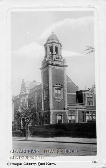 Postcard of the Carnegie Library in East Ham, England. Published by Shamrock & Co. Photographic Printers & Publishers.