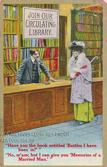Postcard of a man at a reference desk helping a patron. Sign behind the desk reads "Join our circulating library." Text on the card reads: "Have you the book entitled 'Battles I have been in?' "No, m'am; but I can give you 'Memories of a Married Man.'"