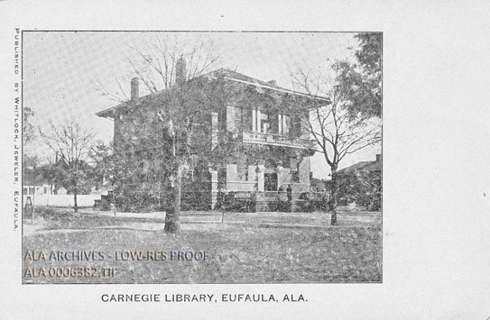 Postcard of the Carnegie Library in Eufaula, Alabama. Published by Whitlock, Jeweler, Eufaula.