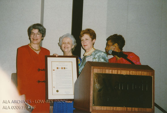 Eileen Cooke receiving an ALA Honorary Membership during the Washington Office 50th anniversary dinner. Photograph includes Mary R. Somerville and Carol Henderson.