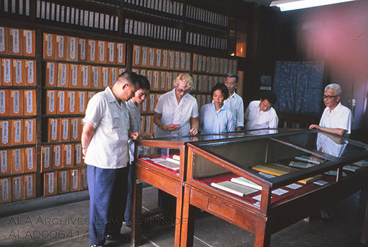 Group looking at an exhibit at the Peking University Library in Beijing, China. Includes Josephine Riss Fang.