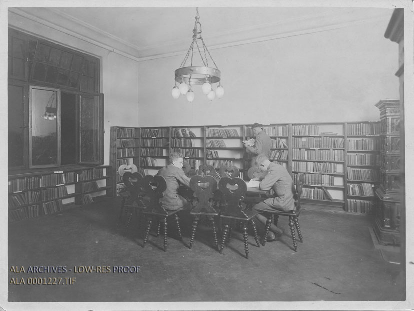 Servicemen in the reading room of an ALA Library after World War I, most likely in Coblenz, Germany.