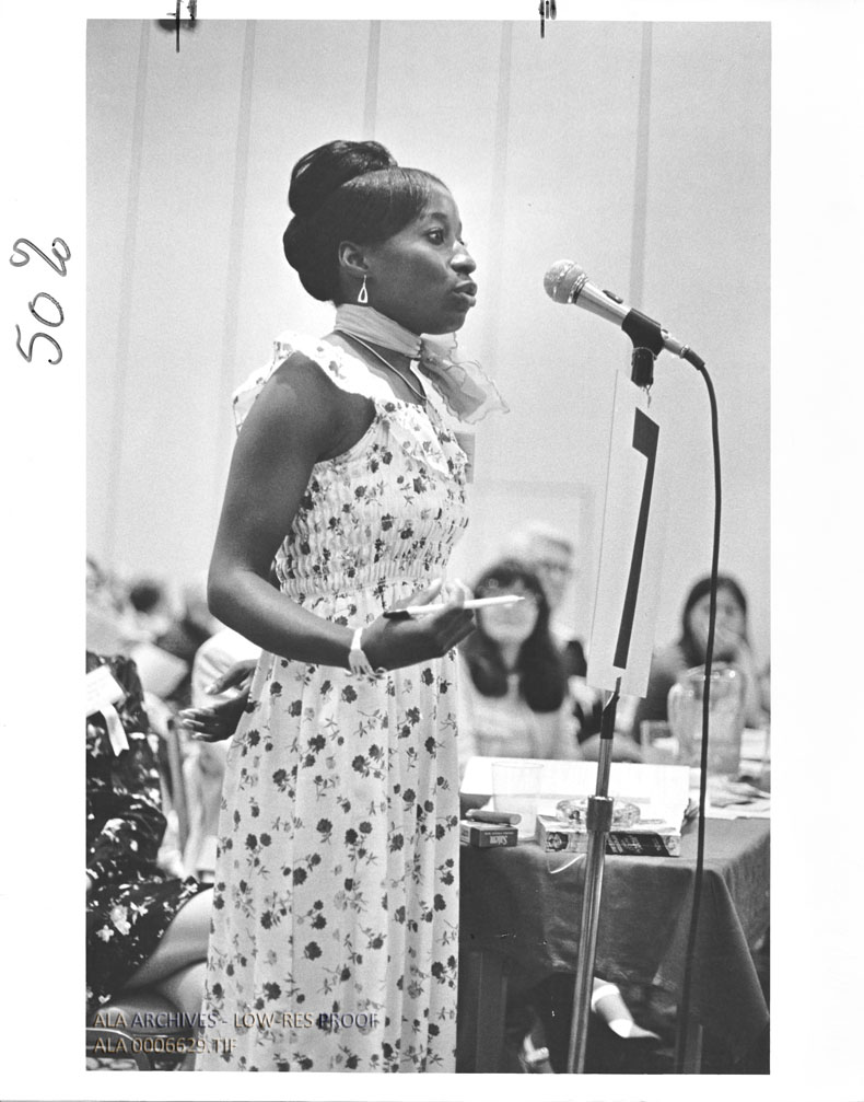 Marva DeLoach giving her support for a resolution to increase library awareness of racism and sexism during the 1976 ALA Annual Conference in Chicago.
