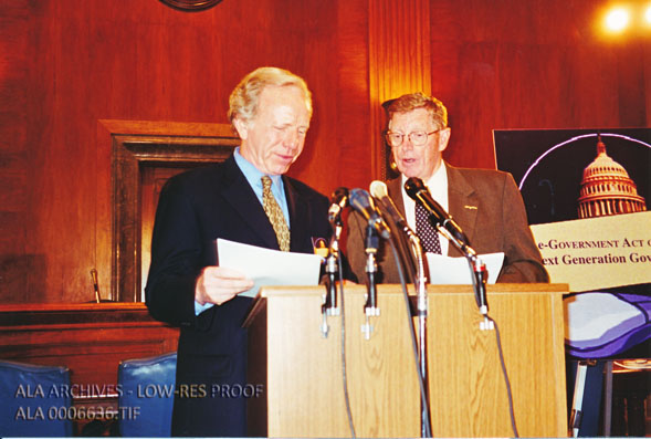 Senators Joseph Lieberman and Conrad Burns introducing the E-Government Act to librarians on National Library Legislative Day.
