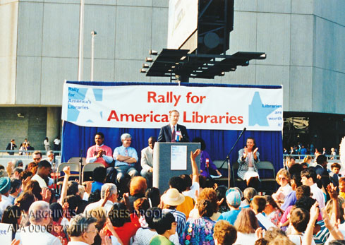 Richard Dougherty speaking during the Rally for America's Libraries during the 1991 ALA Annual Conference.