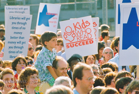 Crowd holding signs at the Rally for America's Libraries during the 1991 ALA Annual Conference.