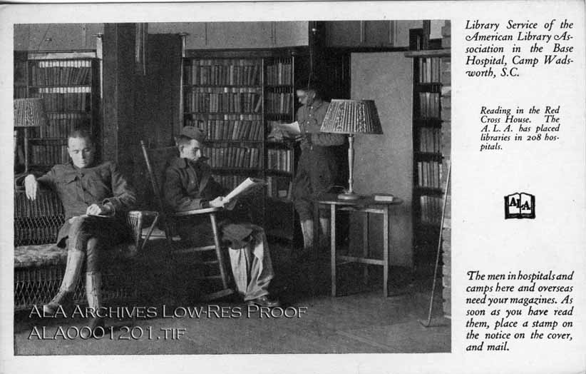 Postcard caption reads: Library Service of the American Library Association in the Base Hospital, Camp Wadsworth, S.C.