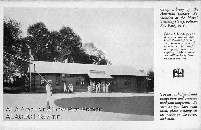 Postcard caption reads: Camp Library of the American Library Association at the Naval Training Camp, Pelham Bay Park, N.Y.