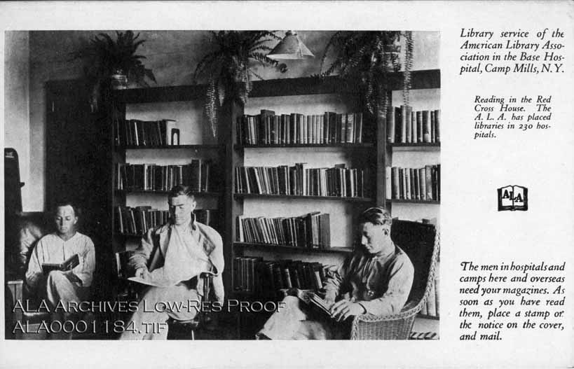 Postcard caption reads: Library service of the American Library Association in the Base Hospital, Camp Mills, N.Y.