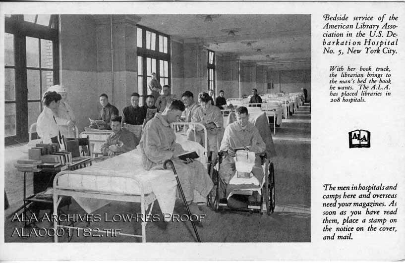 Postcard caption reads: Bedside service of the American Library Association in the U.S. Debarkation Hospital No. 5, New York City.