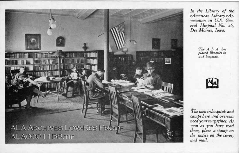 Postcard caption reads: In the Library of the American Library Association in U.S. General Hospital No. 26, Des Moines, Iowa.