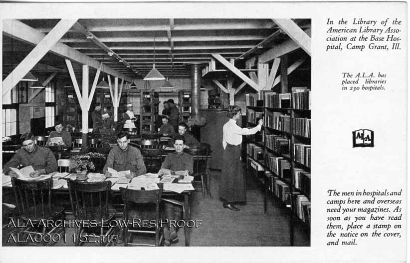 Postcard caption reads: In the Library of the American Library Association at the Base Hospital, Camp Grant, Ill.