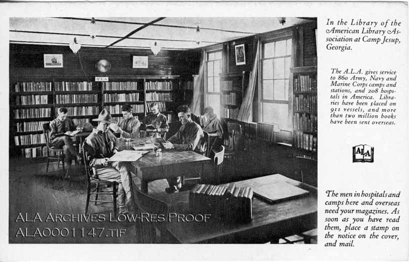 Postcard caption reads: In the Library of the American Library Association at Camp Jesup, Georgia.