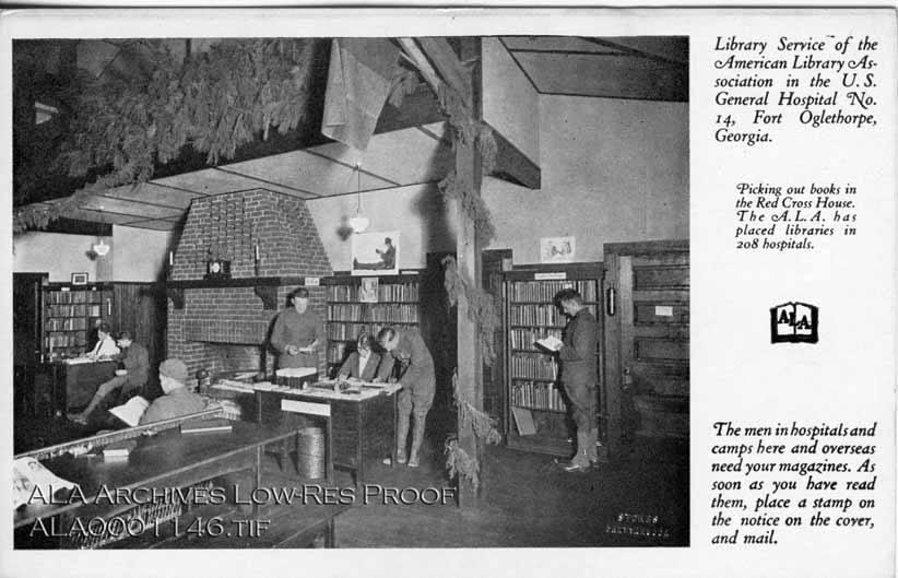 Postcard caption reads: Library Service of the American Library Association in the U.S. General Hospital No. 14, Fort Oglethorpe, Georgia.